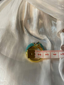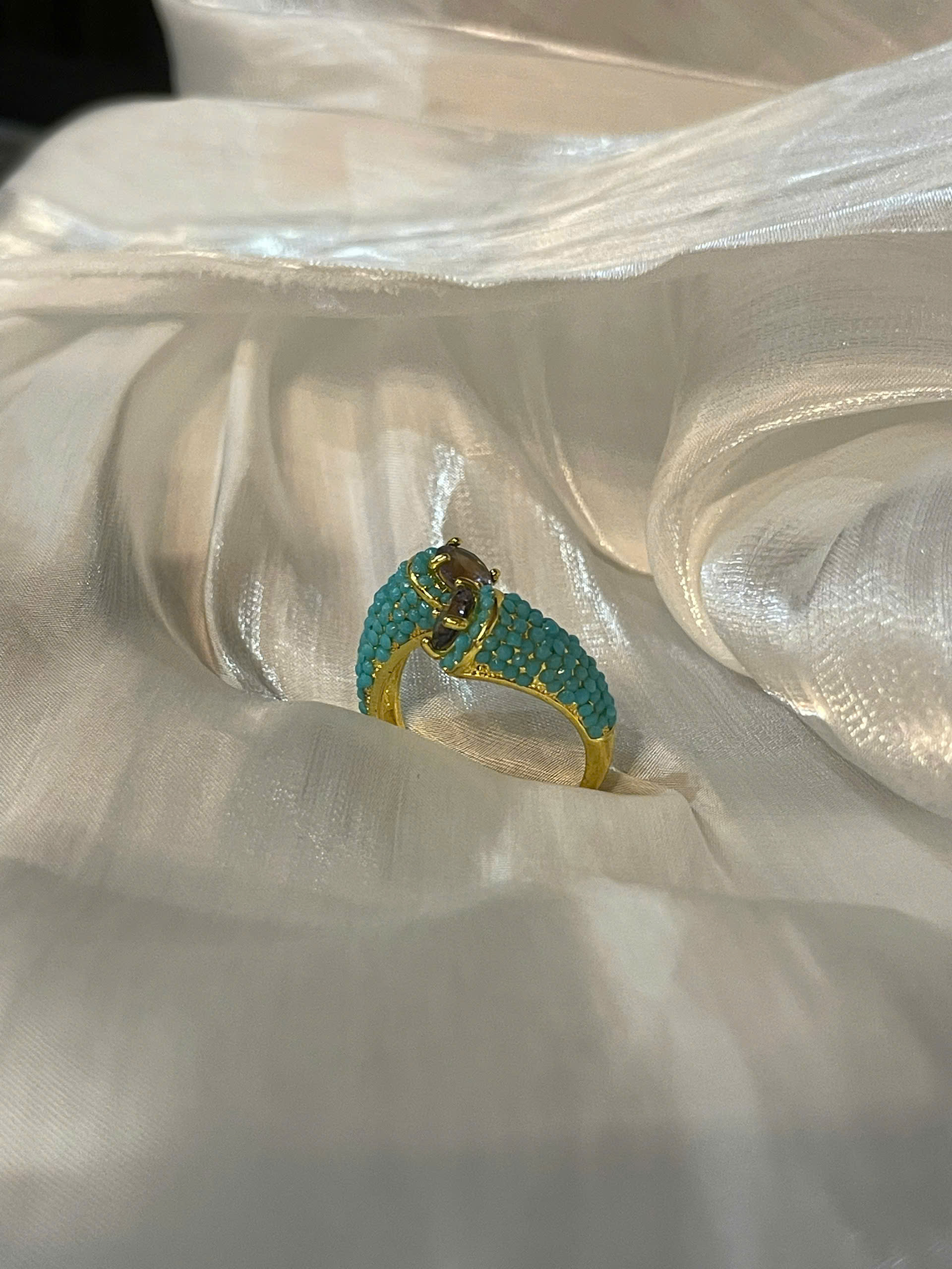 Celebrate sophistication and elegance with this exquisitely crafted gold ring, designed to exude luxury and refinement. The highlight of this piece is the meticulously set small turquoise stones, creating a mesmerizing sparkle that captivates the eye.
