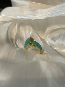 Celebrate sophistication and elegance with this exquisitely crafted gold ring, designed to exude luxury and refinement. The highlight of this piece is the meticulously set small turquoise stones, creating a mesmerizing sparkle that captivates the eye.