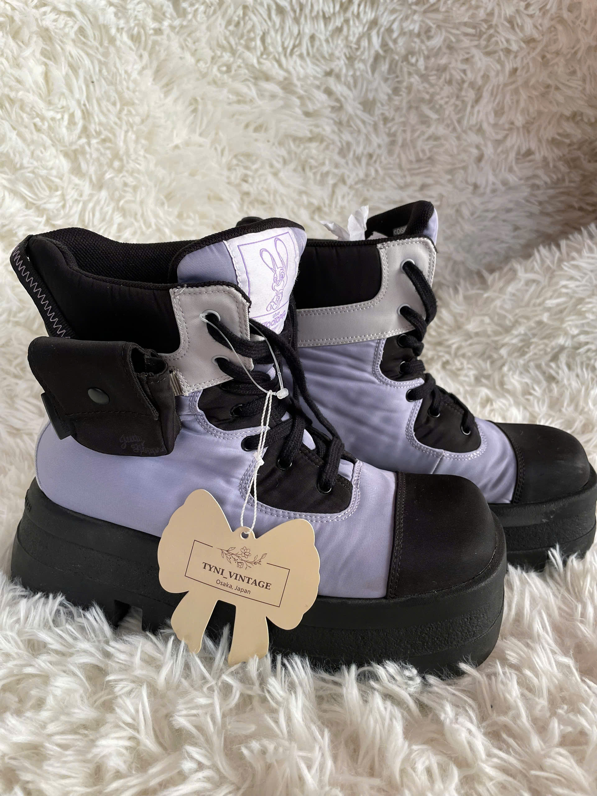 Details: Black lace-up closure, high-top design for ankle support. Features a cute bunny logo printed on the tongue.