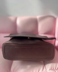 The bag is equipped with a leather crossbody strap that can be adjusted in length to suit the user. The strap often comes with gold or silver plated metal details to add elegance. The bag is designed in a square shape with slightly rounded lines to create a soft and modern feel. The minimalist design style focuses on sophistication and high-quality materials. The solid brown color is a classic tone, easy to coordinate, suitable for all ages.
