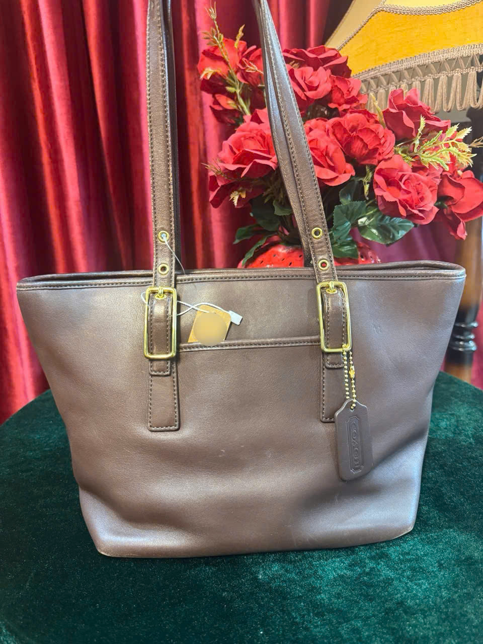 • A brown leather tag with the word “Coach” is attached to one of the straps by a gold-tone metal chain, highlighting the brand.