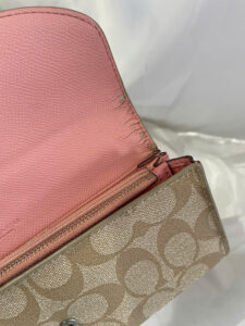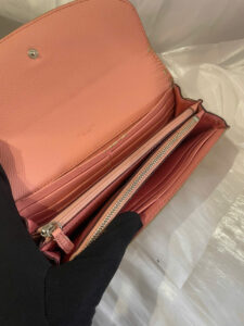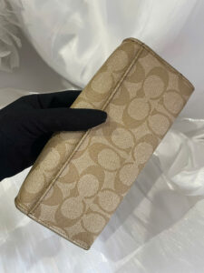 .The Coach long wallet is designed with canvas material featuring the brand’s signature “C” monogram pattern in an elegant beige tone. It has a curved flap with an oval-shaped metal clasp engraved with the Coach logo, and neatly stitched edges. This stylish wallet is ideal for carrying cash, cards, and essential documents.