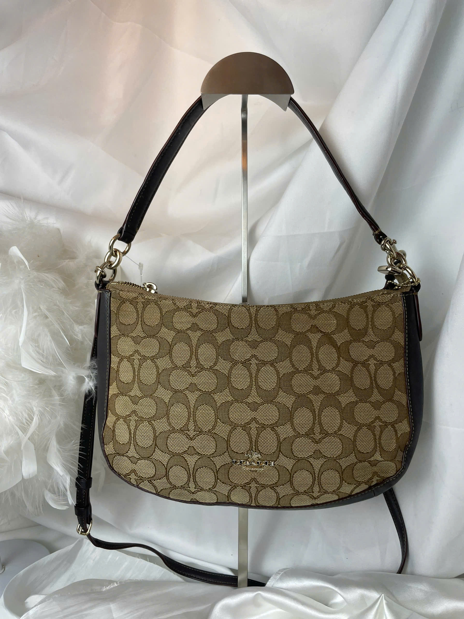 A luxurious shoulder bag from Coach featuring the iconic Signature Canvas pattern, combined with premium black leather trim. Its elegant and stylish design makes it perfect for any occasion, from work to casual outings. Comes with a detachable leather strap, allowing it to be easily transformed into a handbag or crossbody bag for added versatility.
