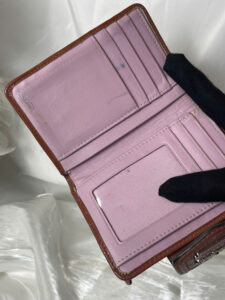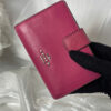 The Coach wallet in the image has a compact design, made from signature C-pattern canvas combined with brown leather trim and a fold-over flap. The front features a metallic Coach logo with a horse and carriage detail on a pink background. The wallet has a secure tab closure, offering a classic yet elegant and functional style.
