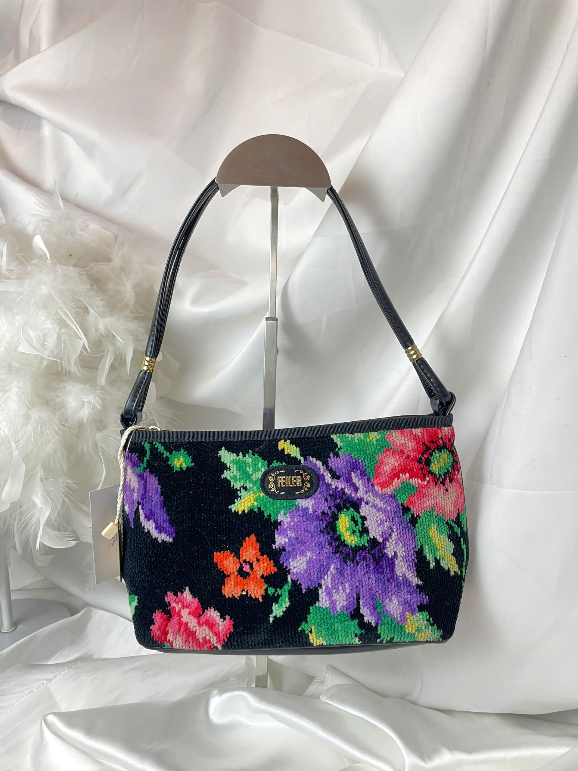 Make a statement with this stunning Feiler vintage embroidered shoulder bag, featuring a vibrant floral pattern meticulously crafted on luxurious black velvet fabric. This exquisite design brings a touch of sophistication and timeless elegance to your outfit.