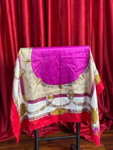 Enhance your wardrobe with this exquisite luxury silk scarf, featuring a sophisticated belt and buckle motif in gold, set against a vibrant pink-purple background. The white and red borders add a striking contrast, making this scarf a standout accessory for any occasion.