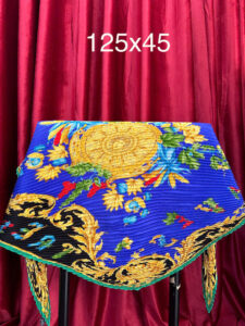 Elegant silk scarf with a vibrant blue background, adorned with golden baroque patterns and colorful floral details. Featuring a pleated texture and neatly stitched green borders, it adds sophistication to any outfit. Perfect as a neck scarf, bag accessory, or stylish accent piece.