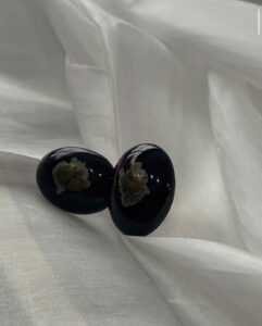 These clip-on earrings feature an elegant oval design with a glossy black surface, exuding a sense of mystery and sophistication at first glance. What makes them truly unique is the subtle floral detail embedded within the dark background, evoking the image of a flower blooming in the night.
