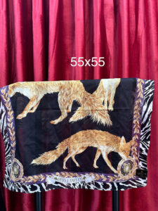 • Design: Luxurious fox motif featuring detailed fox illustrations on a mysterious black background. The scarf’s border is adorned with animal print and laurel wreath patterns, adding a bold and elegant touch.