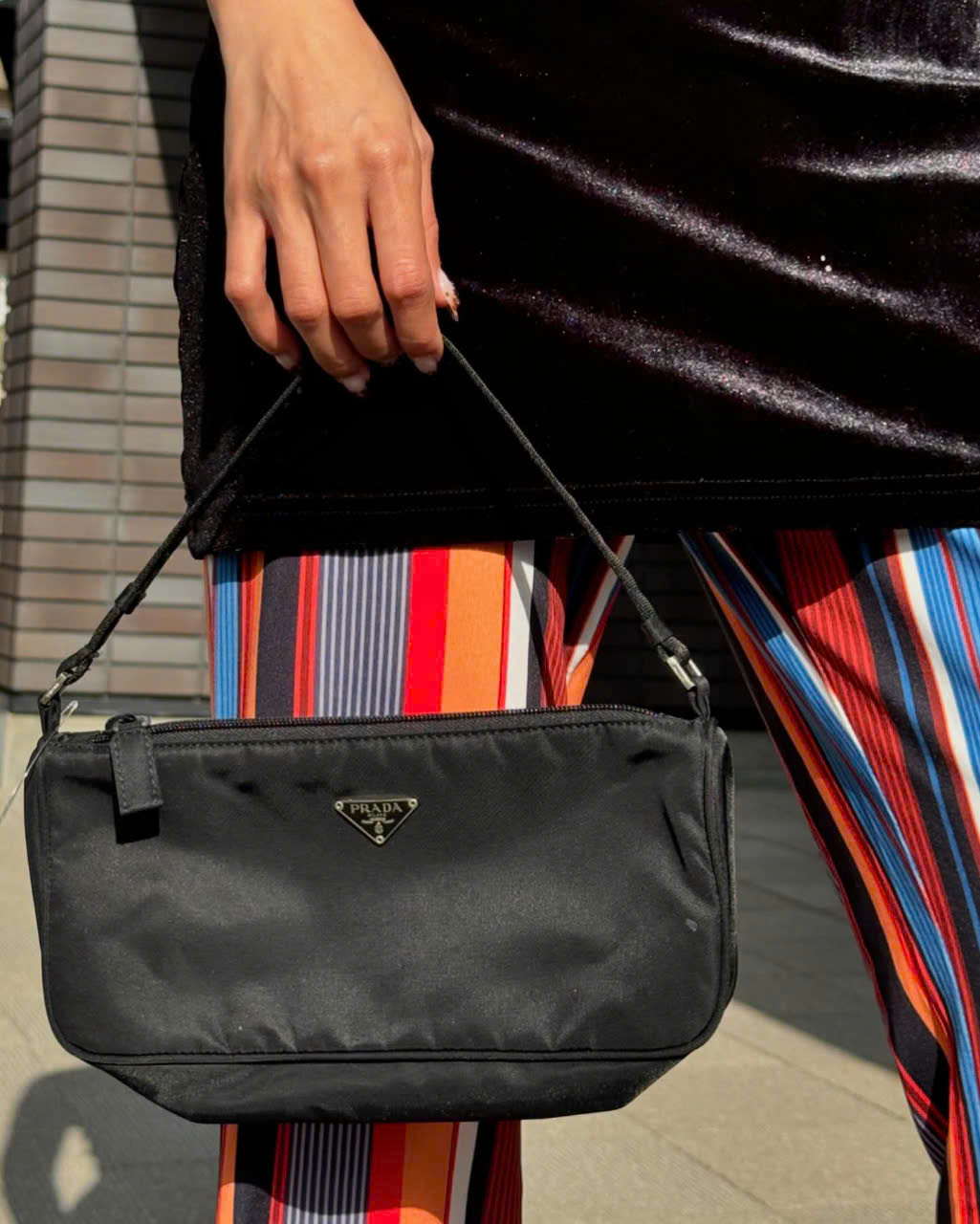 Details: Features the iconic Prada metal logo on the front, adding a touch of glamour.