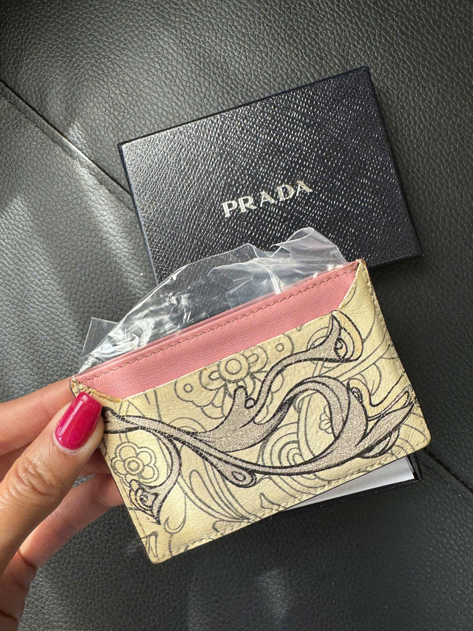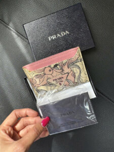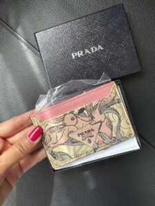 Prada wallet has a compact design, unique rabbit pattern on a gentle color background, feminine pink border. High-quality product, comes with a luxurious box, suitable for holding cards and small items.