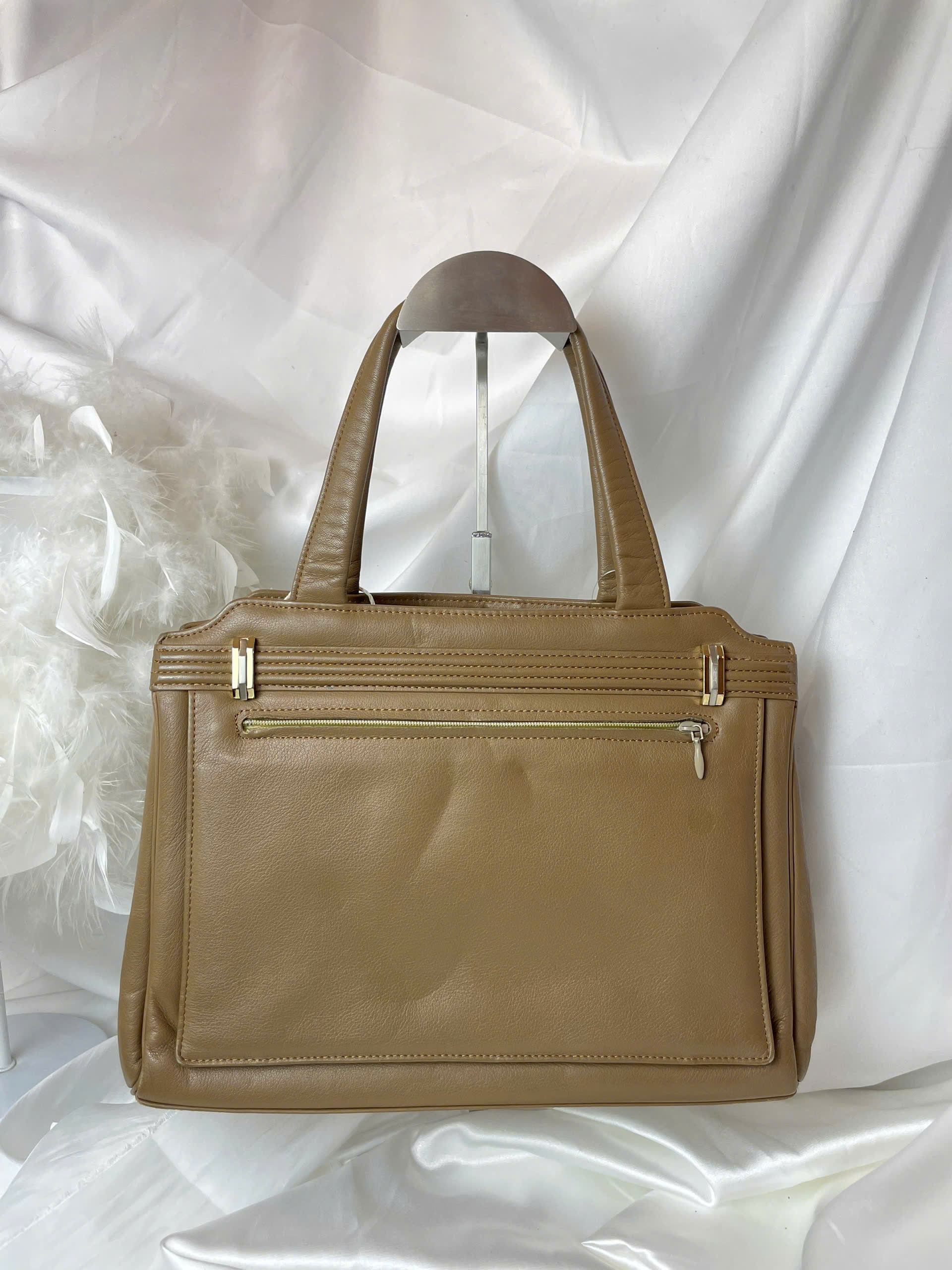 A high-quality leather handbag in a luxurious beige-brown tone, perfect for both work and casual outings. The minimalist yet sophisticated design enhances a modern and elegant look.