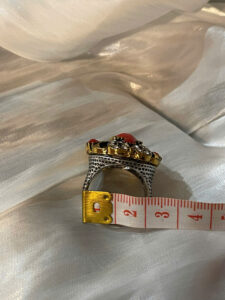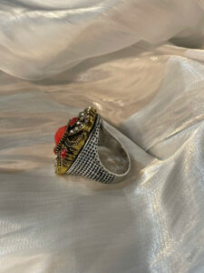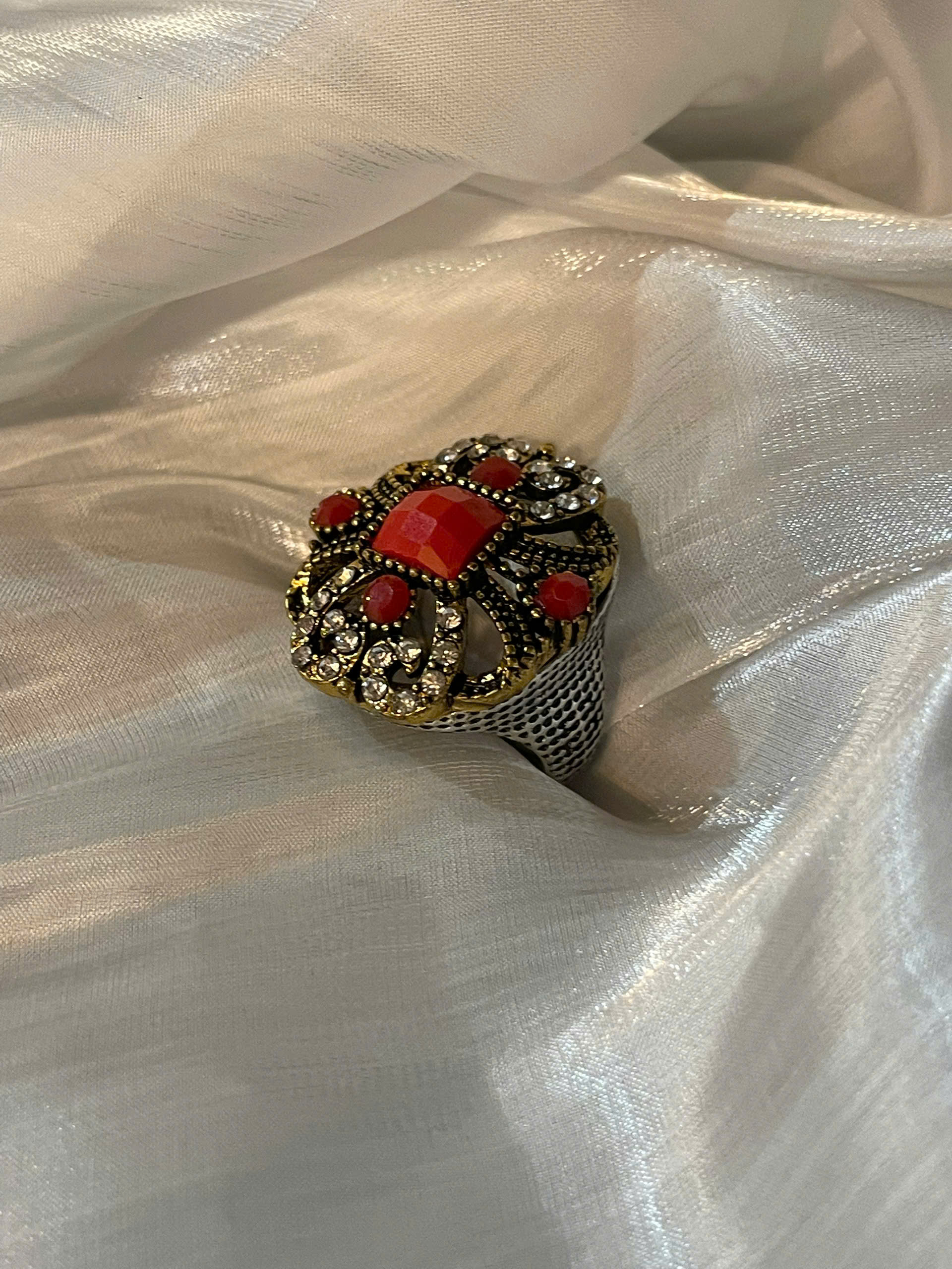 The ring features a royal-inspired design with intricate details, highlighted by a central red gemstone surrounded by sparkling smaller stones and antique gold-tone metal accents, exuding elegance and nobility.