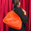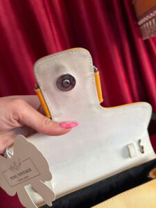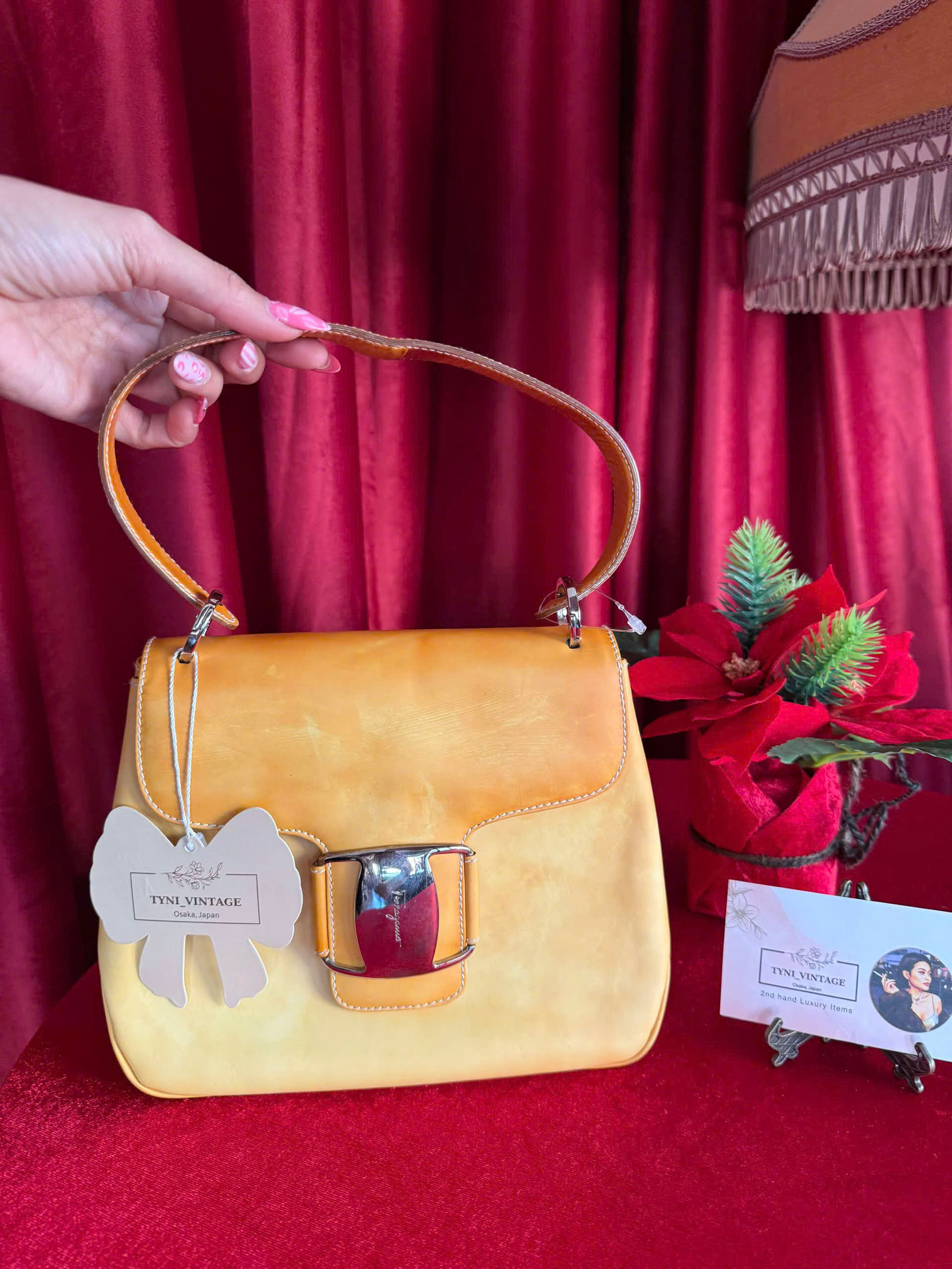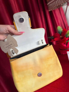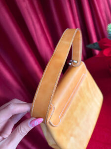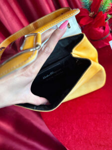 This vintage yellow leather handbag exudes elegance and sophistication with its structured silhouette and high-quality craftsmanship. The bag features a smooth, slightly aged leather surface that enhances its classic charm.