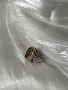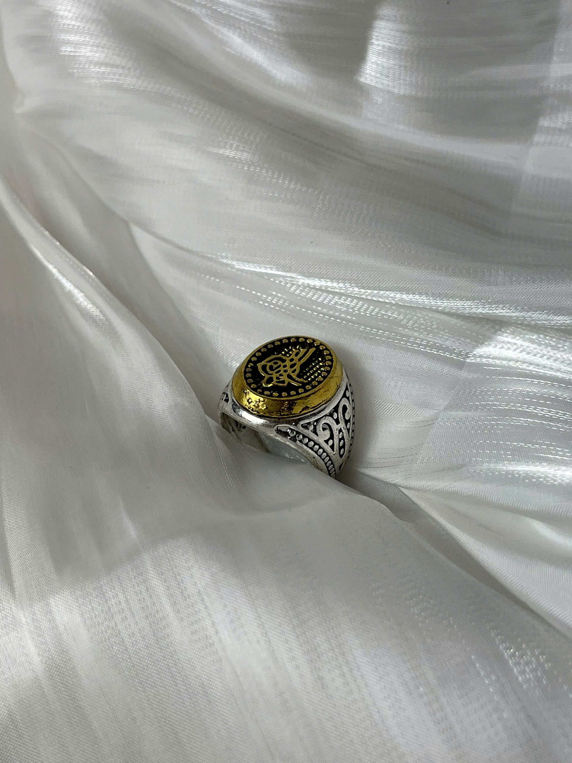 The royal-style men’s ring exudes power with its intricate design, combining silver and gold. The ring’s face is meticulously crafted with delicate engravings, creating a bold yet sophisticated appearance.
