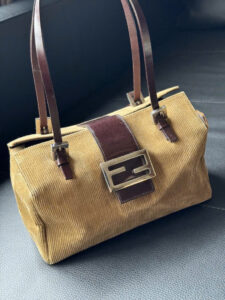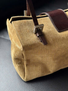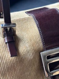 • Đóng cửa: Chiếc túi có dây đeo bằng da màu nâu sẫm chạy dọc qua trung tâm, kết hợp với khóa kim loại màu bạc hình chữ nhật hiển thị logo “FF” mang tính biểu tượng, có thể là từ thương hiệu Fendi. Khóa bạc sáng bóng đóng vai trò như một tâm điểm phong cách.