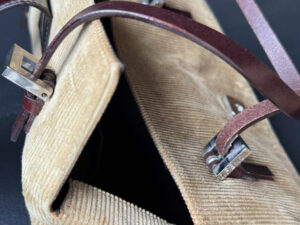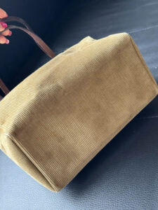 Chiếc túi trong hình có thiết kế hình hộp hình chữ nhật được làm bằng vải nhung, màu nâu mù tạt, mang lại vẻ cổ điển và thanh lịch.
