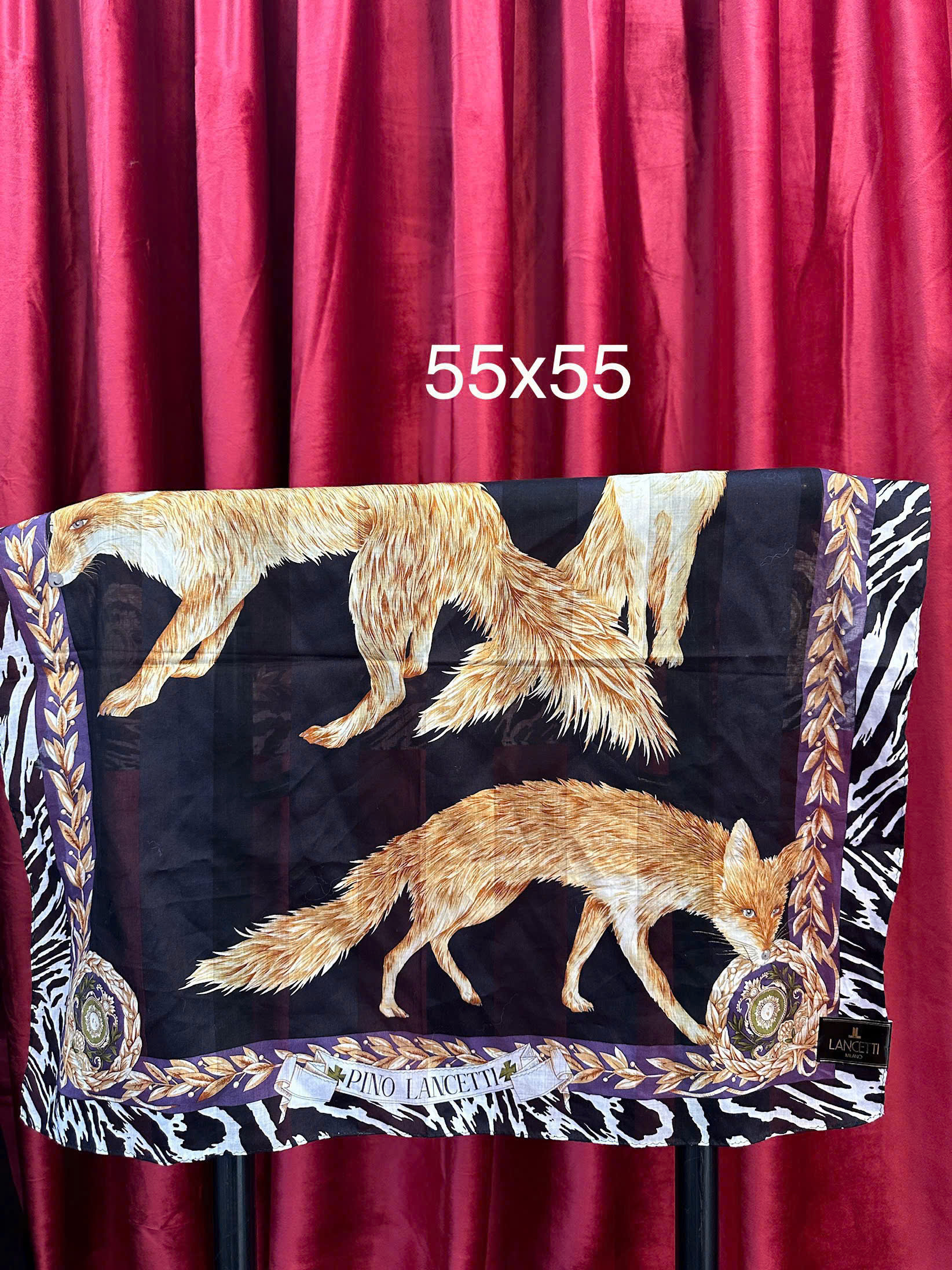 Khăn vuông 55×55 cm mang phong cách sang trọng với hình ảnh những chú cáo sắc nét trên nền đen huyền bí. Viền khăn được trang trí họa tiết da thú và vòng nguyệt quế, tạo nên vẻ ngoài độc đáo và cá tính. Chất liệu mềm mại, thích hợp làm phụ kiện thời trang đa dụng.