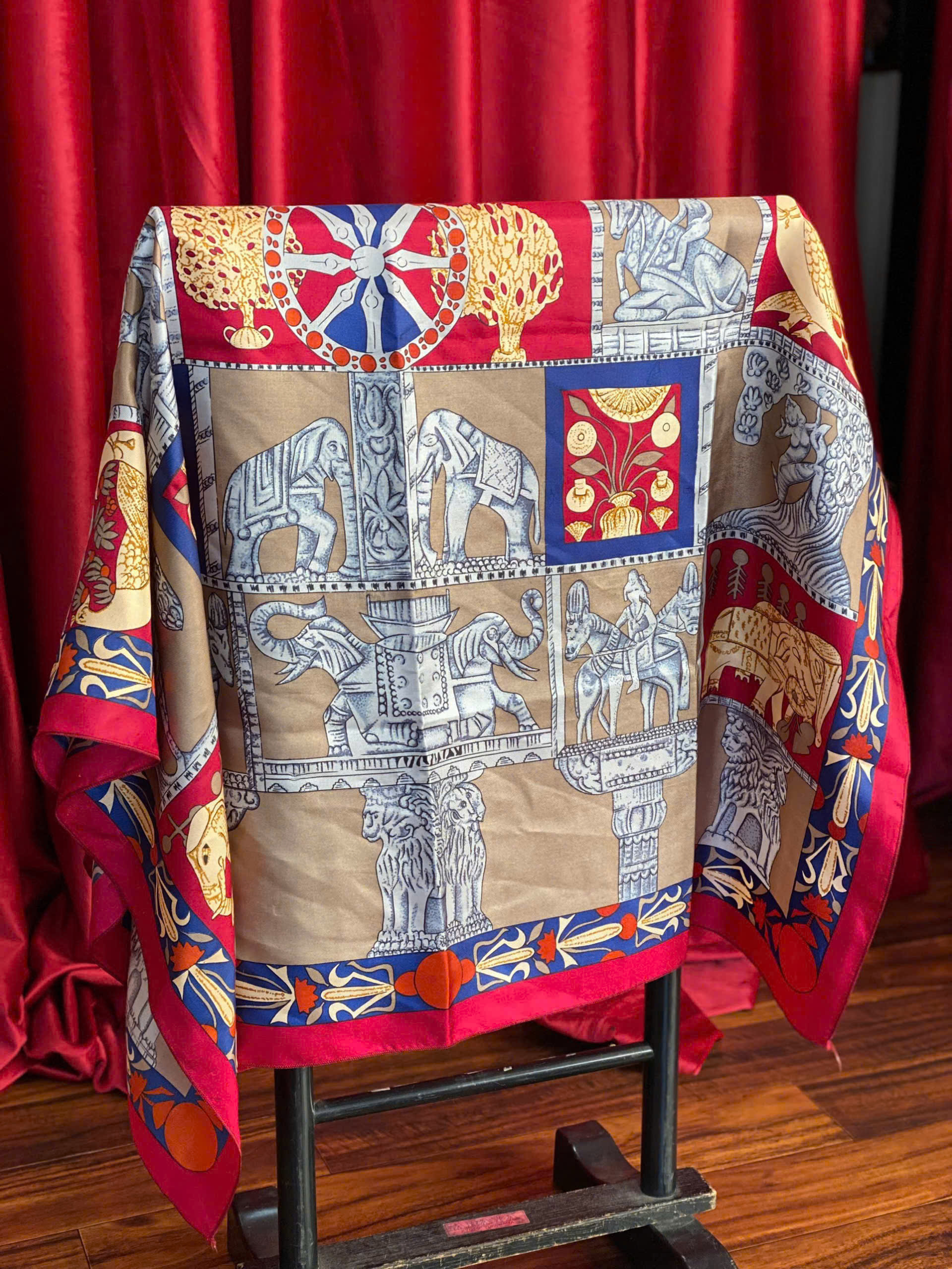 Chiếc khăn lụa cao cấp này mang đậm phong cách nghệ thuật với họa tiết lấy cảm hứng từ nền văn hóa cổ đại. Các hình ảnh tinh xảo về voi, sư tử và hoa văn trang trí được sắp xếp hài hòa, tạo nên một tổng thể sang trọng và độc đáo.
