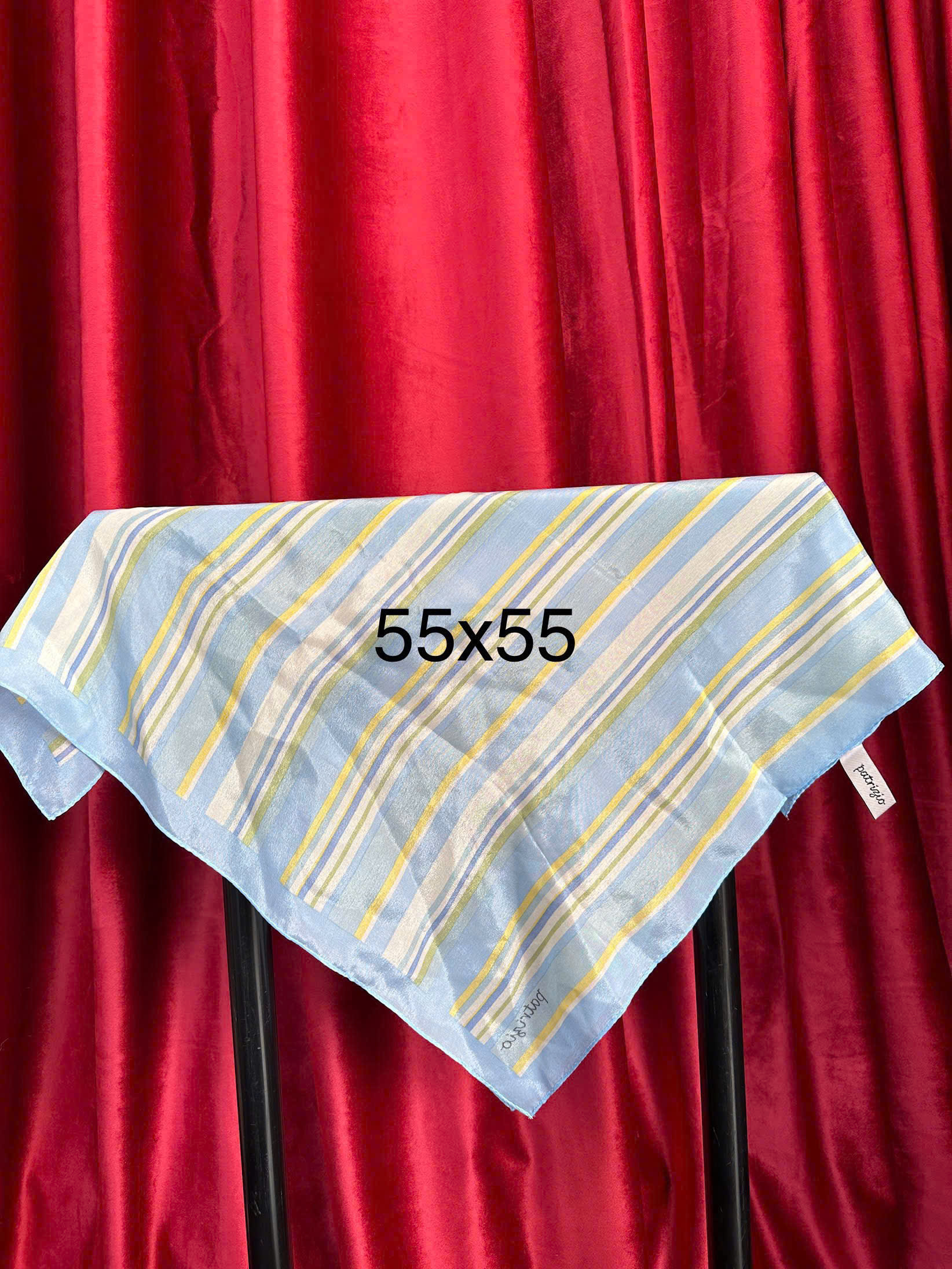 Tạo điểm nhấn tinh tế cho phong cách của bạn với khăn lụa kẻ sọc xanh pastel thanh lịch. Với kích thước 55×55 cm, chiếc khăn vuông này có thiết kế sọc vàng và trắng trên nền xanh pastel mềm mại, tạo nên vẻ đẹp cổ điển và dễ dàng phối hợp với nhiều trang phục.