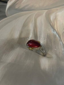 Tôn vinh vẻ đẹp quý phái và sang trọng, chiếc nhẫn này được chế tác tinh xảo từ bạc cao cấp, kết hợp với điểm nhấn là viên đá đỏ hình giọt lệ rực rỡ. Viên đá được bao bọc bởi khung nhẫn chắc chắn, có các chi tiết mạ vàng tinh tế, tạo nên sự hài hòa giữa nét cổ điển và hiện đại. Thiết kế thanh lịch cùng sự kết hợp giữa bạc và vàng giúp chiếc nhẫn trở thành món trang sức đẳng cấp, phù hợp cho các buổi tiệc sang trọng hoặc làm quà tặng ý nghĩa cho người thân yêu.