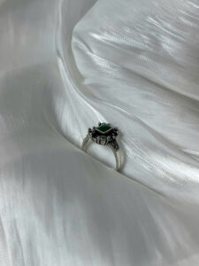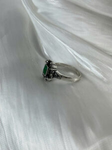 Chiếc nhẫn bạc nữ này được chế tác tinh xảo từ bạc cao cấp, mang lại vẻ đẹp sang trọng và quý phái cho người đeo. Mặt nhẫn nổi bật với viên ngọc lục bảo tổng hợp hình giọt nước, tạo điểm nhấn tinh tế và thu hút ánh nhìn.