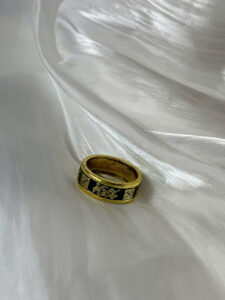 Chiếc nhẫn mang thiết kế mạnh mẽ và đầy uy quyền, được chế tác từ vàng với bề mặt rộng, tạo cảm giác vững chắc và đẳng cấp. Điểm nhấn đặc biệt của nhẫn là hình rồng uy nghi được khắc tinh xảo trên nền đen, tượng trưng cho sức mạnh, quyền lực và sự may mắn trong phong thủy. Các họa tiết xung quanh được chạm khắc tỉ mỉ, tạo nên sự hài hòa giữa nét cổ điển và hiện đại.