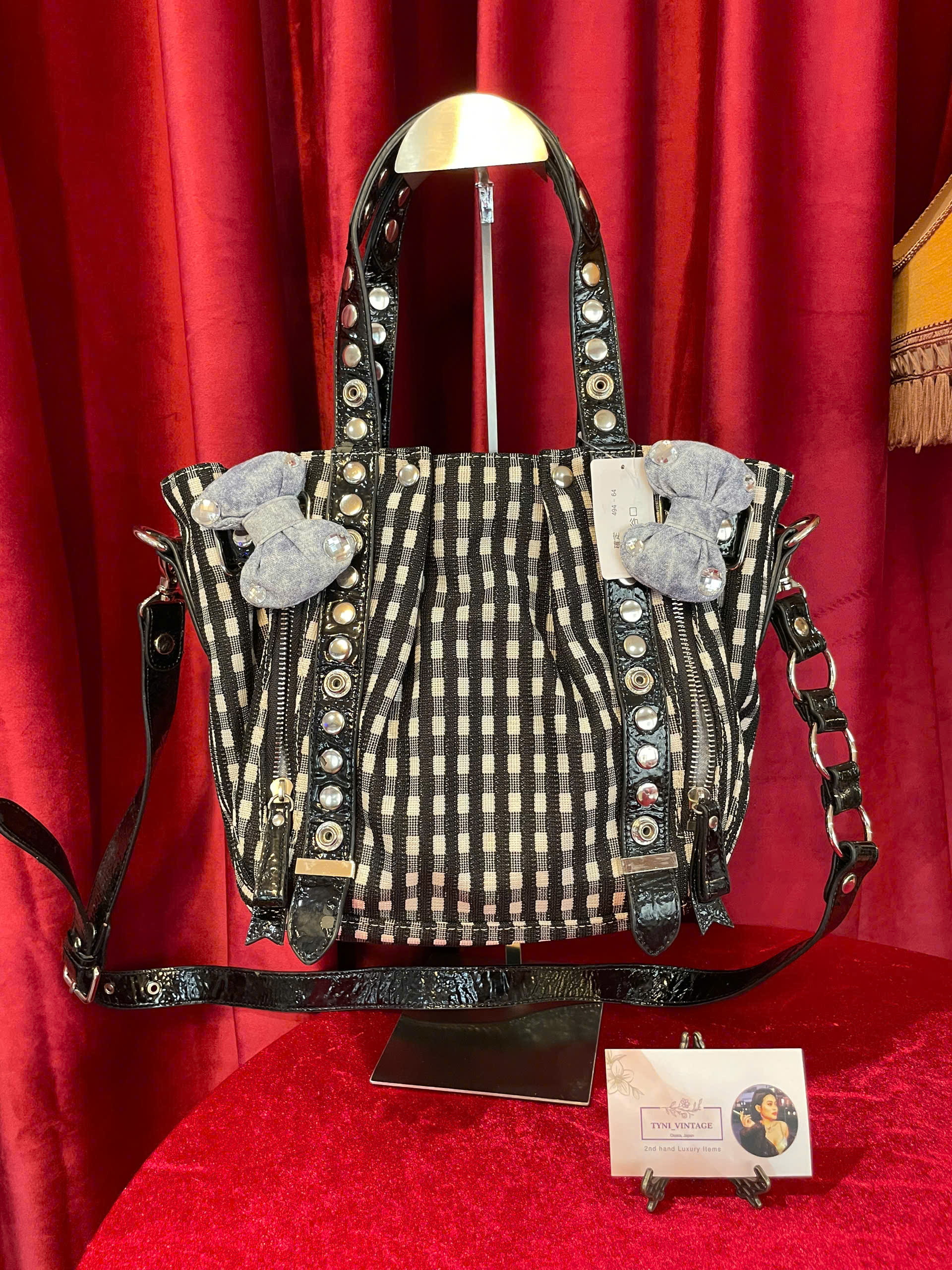 Chiếc túi có phong cách vintage pha lẫn cá tính với họa tiết kẻ caro đen trắng làm nền. Chất liệu vải dệt mang lại cảm giác mềm mại nhưng vẫn giữ được phom dáng chắc chắn.