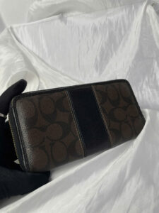 Ví Coach Signature Accordion – Được chế tác từ vải bạt và da tráng cao cấp với tông màu nâu đen cổ điển. Có họa tiết chữ “C” đặc trưng, khóa kéo xung quanh, nhiều khe cắm thẻ và nội thất rộng rãi để đựng tiền mặt và các nhu yếu phẩm. Một sự lựa chọn kiểu dáng đẹp và phong cách!