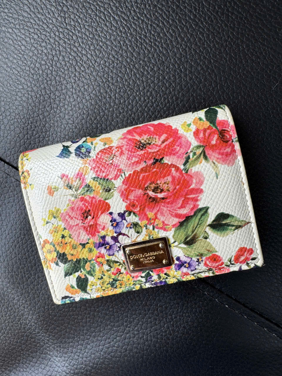 Một chiếc ví nhỏ gọn với nền chủ yếu là màu trắng, được trang trí bằng các họa tiết hoa rực rỡ. Mặt trước có chi tiết kim loại mang logo “Dolce & Gabbana”, tăng cường sự quyến rũ nữ tính và sang trọng của nó.