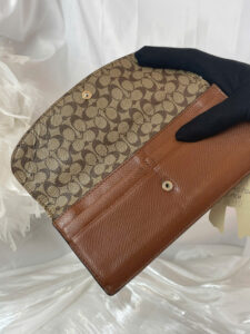 • Logo kim loại tinh xảo: Logo Coach được hiển thị trang nhã bằng kim loại sáng bóng bên ngoài ví, làm nổi bật uy tín của thương hiệu.