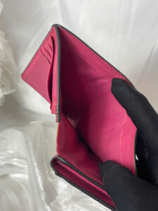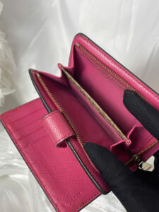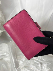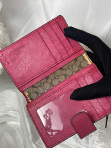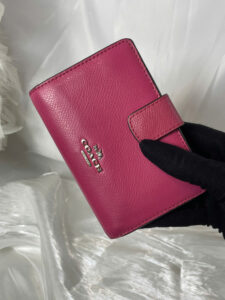 Ví trong hình là một chiếc ví màu hồng đậm được làm bằng da có kết cấu. Nó có thiết kế nhỏ gọn với nắp gập được cố định bằng dây đeo phù hợp. Ở mặt trước có logo kim loại tông màu bạc của thương hiệu “Coach”. Người cầm ví đang đeo găng tay màu đen, tạo sự tương phản với màu sắc của ví. Nền có chất liệu vải trắng sáng bóng, làm cho chiếc ví trở nên nổi bật.
