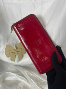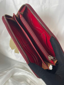 Ví là một chiếc ví dài có khóa kéo được làm bằng da đỏ tía bóng. Nó có thiết kế sang trọng với logo thương hiệu dập nổi trên bề mặt, khóa kéo chắc chắn và thẻ treo trang nhã. Hoàn hảo cho một phong cách tinh tế và sang trọng.