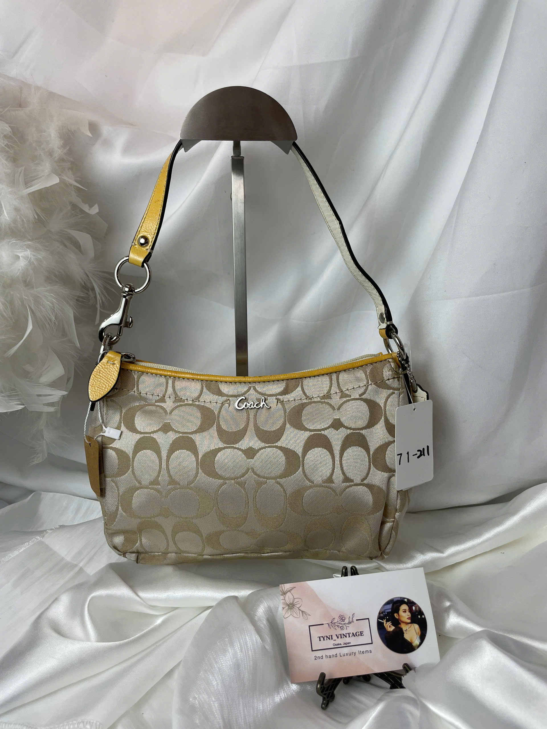 The Coach Signature Hobo bag exudes elegant beauty with its soft rounded design, creating a luxurious yet youthful style. • Material: Canvas covered with Coach’s distinctive monogram logo, combined with premium gold-colored leather trim. • Color: Beige with gold trim, providing harmony while still being eye-catching. • Design: The bag has a compact yet spacious form, convenient for everyday needs. The sturdy zipper closure helps protect the contents inside. • Strap: The leather strap features two tones of gold and white, allowing for flexible detachment to wear on the shoulder or carry by hand depending on your style. • Accessories included: Authentic leather tag, a metallic Coach logo attached to the front adds a subtle highlight.