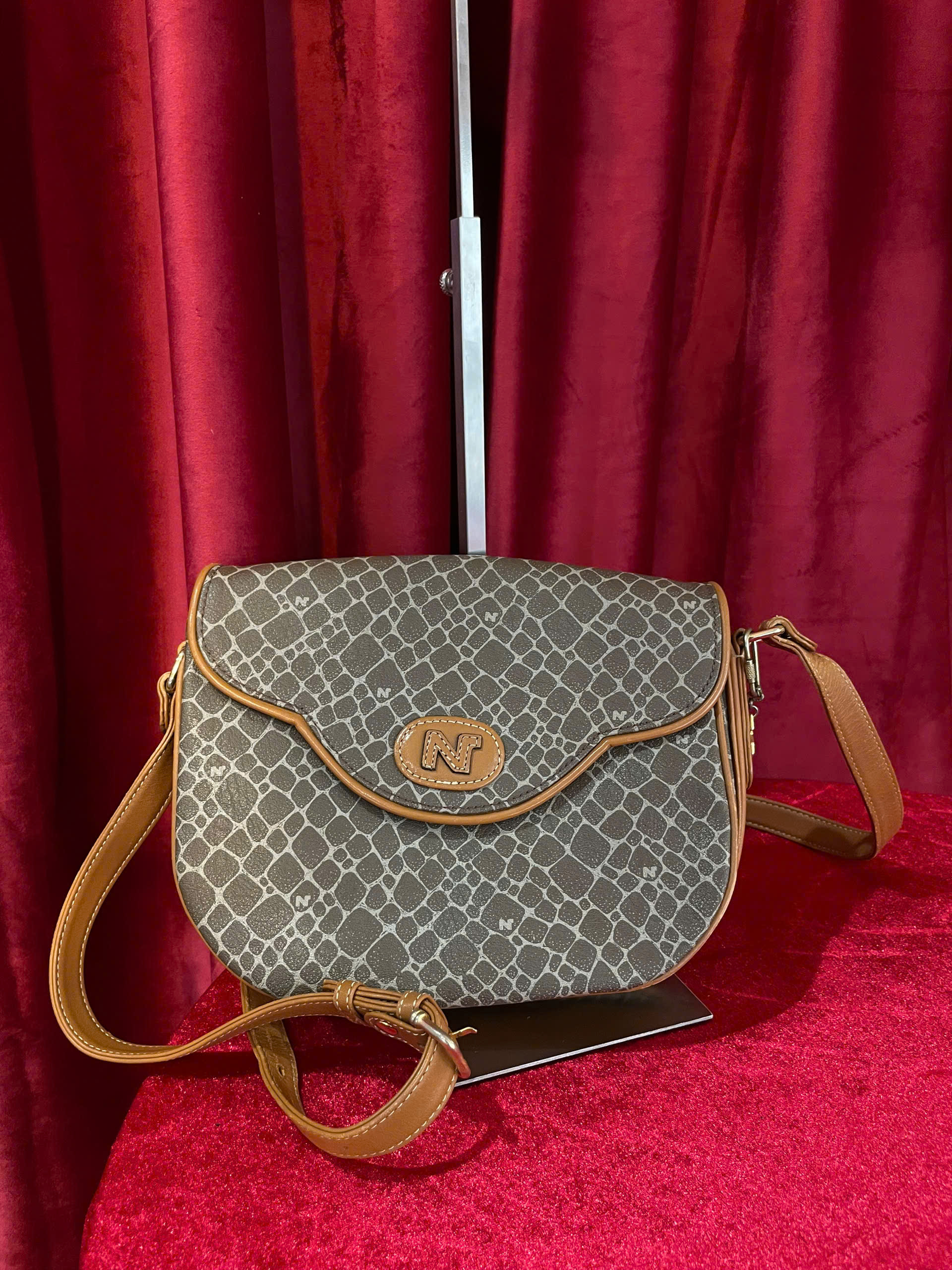 This elegant women’s crossbody bag is a perfect blend of sophistication and practicality. Featuring a stylish snakeskin pattern in a neutral gray tone, the bag is designed to complement various outfits and occasions. The high-quality synthetic leather exterior is adorned with subtle brand initials (N) across the surface, adding a touch of exclusivity.