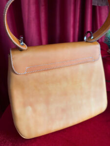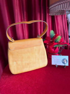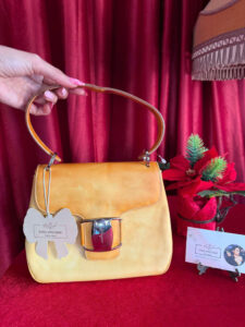 Một chiếc túi da màu vàng với thiết kế cổ điển và thanh lịch, có khóa kim loại sáng bóng ở mặt trước. Tay cầm chắc chắn phù hợp để cầm tay hoặc kết hợp với dây đeo dài. Được làm từ da chất lượng cao, nó mang lại vẻ ngoài tinh tế, hoàn hảo cho những dịp đặc biệt hoặc sử dụng hàng ngày.