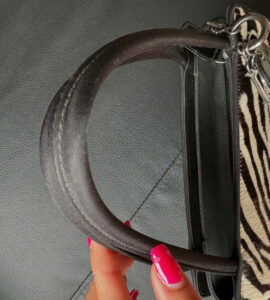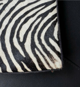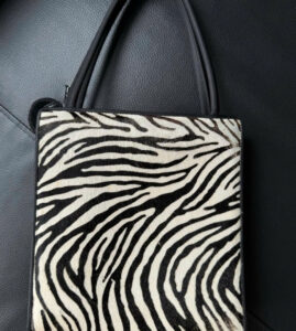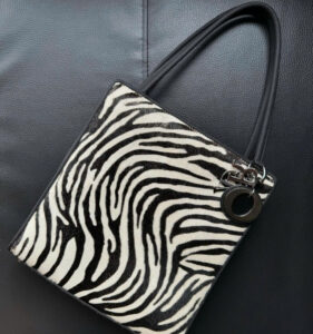 Chiếc túi có thiết kế sang trọng với họa tiết da ngựa vằn đen trắng nổi bật. Nó có kiểu dáng vuông vắn, chất liệu lông mềm mại, tay cầm da đen chắc chắn và điểm nhấn là charm kim loại sáng bóng mang phong cách hiện đại.