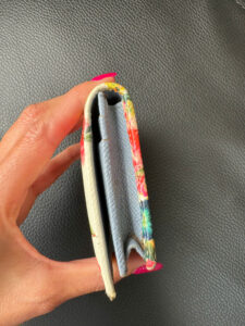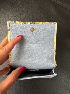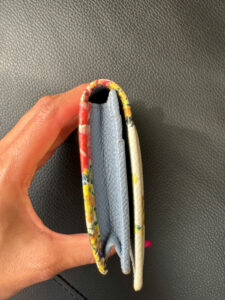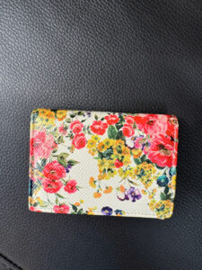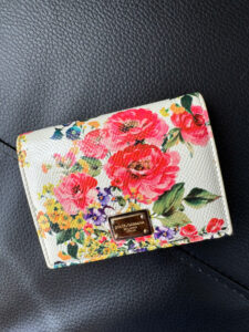 Một chiếc ví nhỏ gọn với nền chủ yếu là màu trắng, được trang trí bằng các họa tiết hoa rực rỡ. Mặt trước có chi tiết kim loại mang logo “Dolce & Gabbana”, tăng cường sự quyến rũ nữ tính và sang trọng của nó.